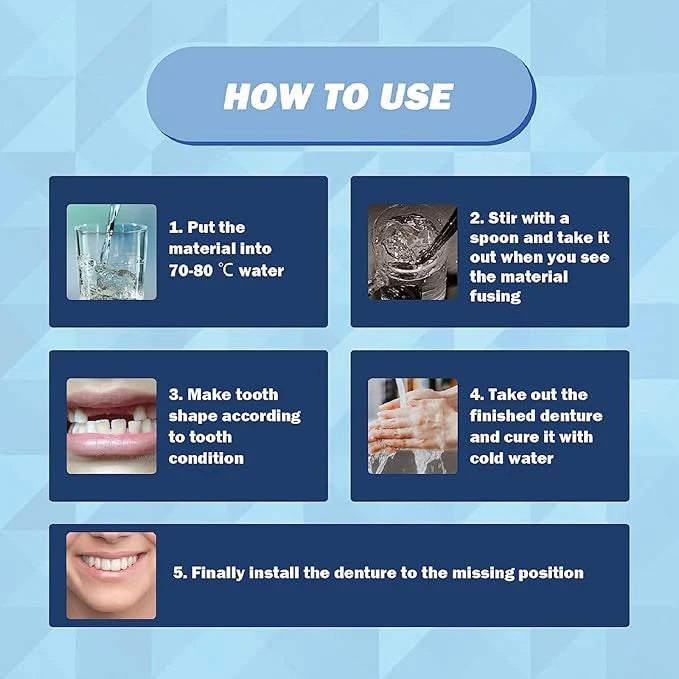 Get a Hollywood smile with Moldable False Teeth! This high-quality and totally safe kit is perfect for filling in missing, broken, or gappy teeth. After a few minutes in boiling water, it can be customized to fit your exact shape and size - so you'll be ready to flash those pearly whites in no time! Say goodbye to your worries and hello to a beautiful, natural-looking smile.